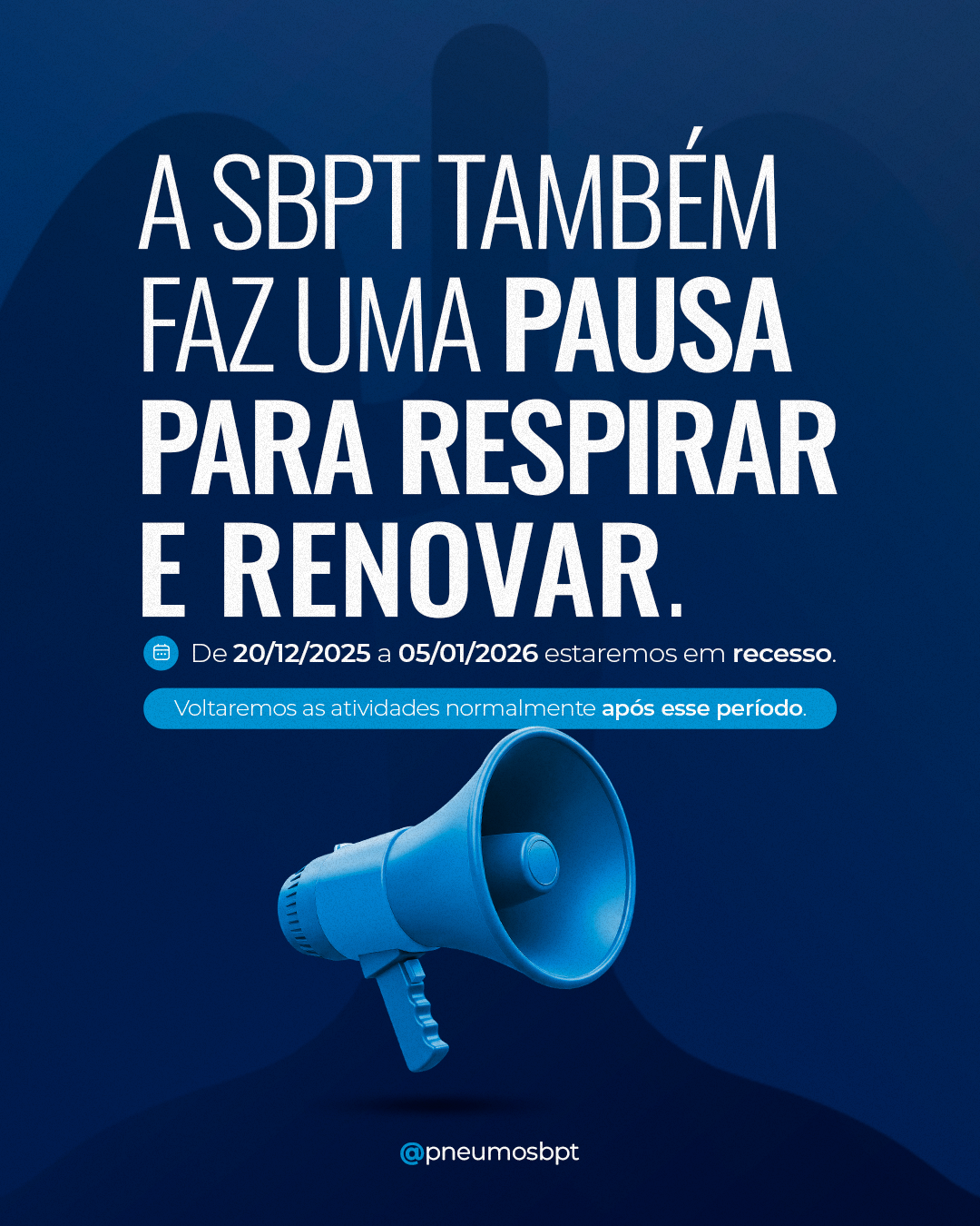 A SBPT agradece a compreensão durante o recesso, bem como a confiança, o engajamento e o apoio de toda a comunidade pneumológica, desejando a todos um período de descanso, saúde e esperança para 2026.